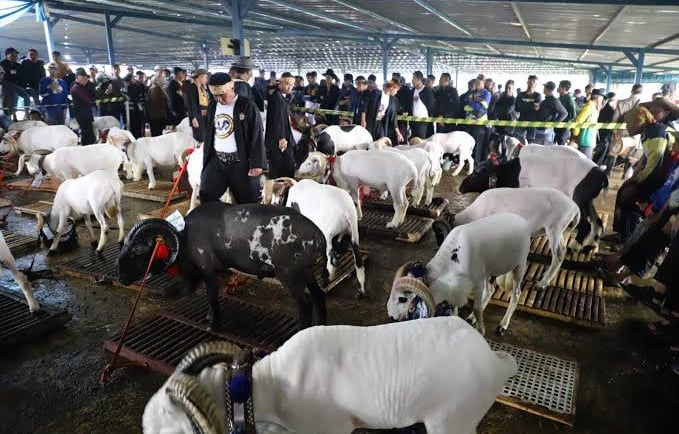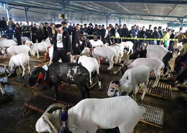 Display domba Garut di stan pameran atau bazar yang memungkinkan pembeli langsung melihat kualitas fisik domba.